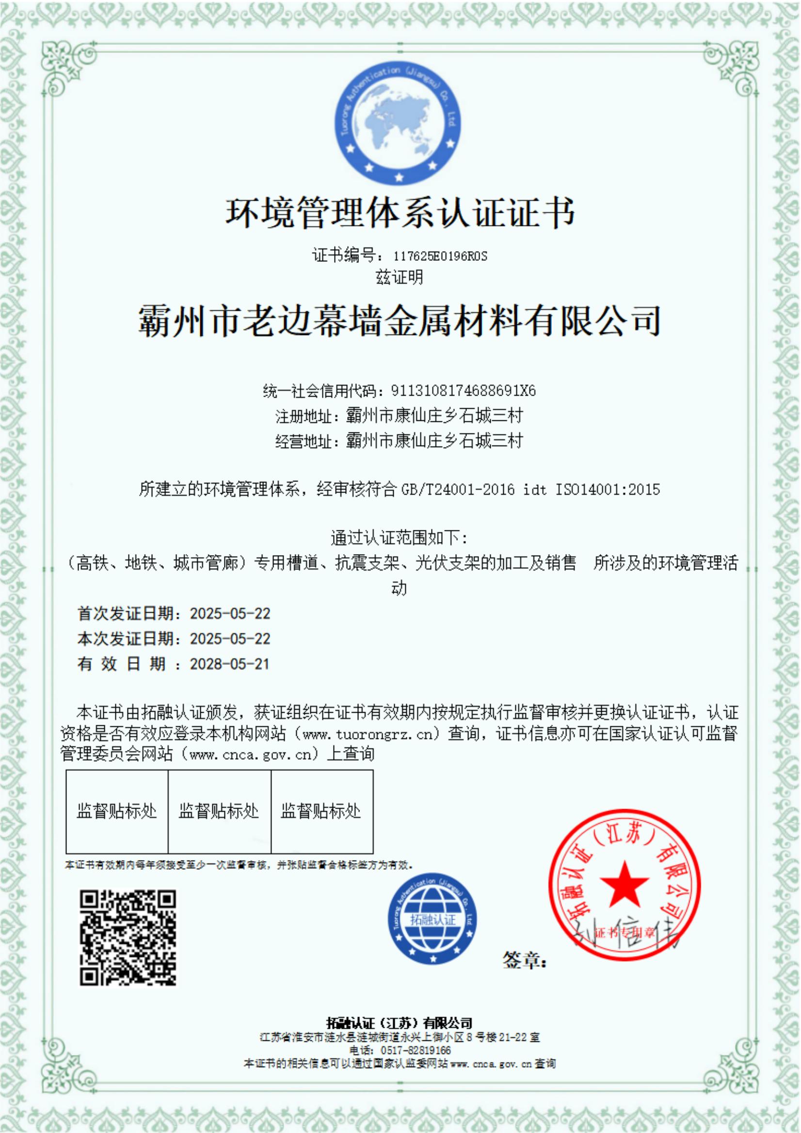 環(huán)境管理體系認(rèn)證證書