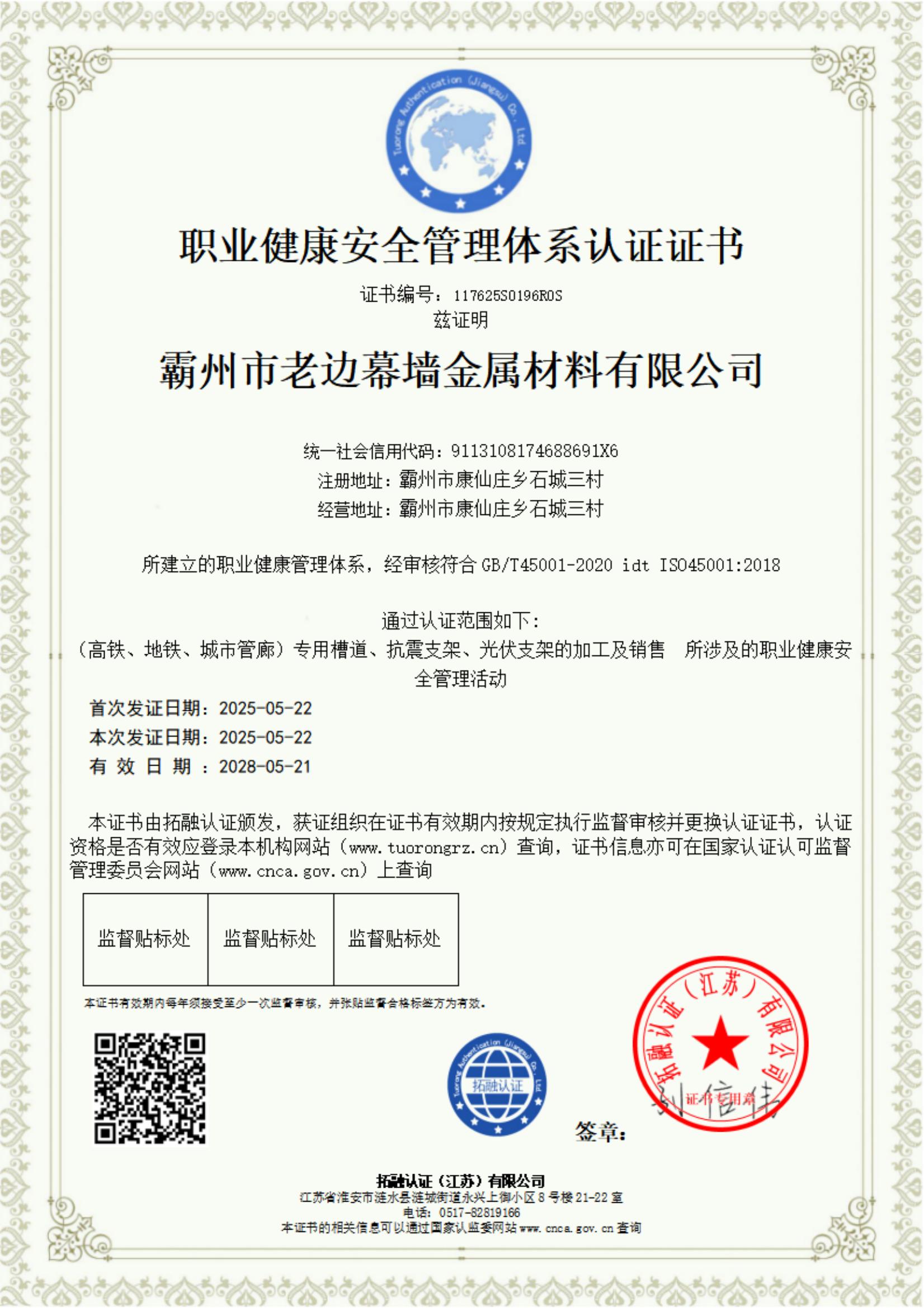 職業(yè)健康安全管理體系認(rèn)證證書